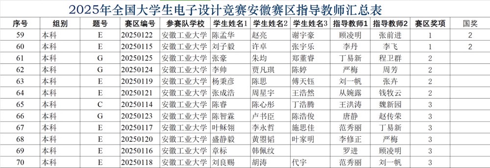 2025年8月22日,由教育部和工业和信息化部共同主办的2025年全国大学生电子设计竞赛安徽省赛区竞赛在安徽师范大学圆满落幕。我院电气与信息工程学院顾凌明、张前进老师指导,学生陈孟华、赵亮、谢宇豪的作品,以及李丹、李飞老师指导,学生刘子毅、许卓、张宇乐的作品荣获全国二等奖。