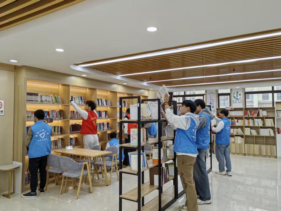活动分为“志愿清洁书香阵地”与“红色故事浸润童心”两部分。学生志愿者们身穿马甲,手持清洁工具,来到社区的图书室。由于前期社区工作人员力量不足导致部分书架积尘等情况,志愿服务队员们分为图书分类组、卫生清扫组、环境布置组,各司其职。在志愿者的努力下,社区图书室焕然一新,藏书分类清晰规范,环境整洁明亮。社区负责人在协调志愿者服务时,道出心声:“志愿者的服务,让我们的图书室不仅书籍归类更加整齐有序,也让图书室的环境更加清洁亮丽,让图书室成为居民愿意来、喜欢来的‘精神加油站’。在这里要特别感谢安工大的志愿者们。”