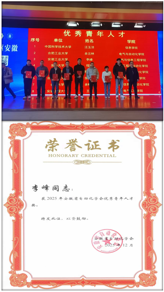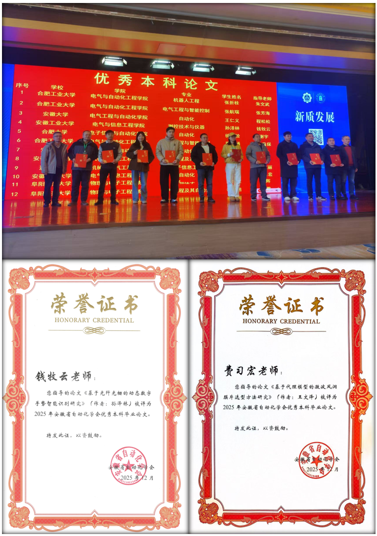 会上发布了2025年度安徽高校自动化专业教育领域的多项奖项,我院喜获安徽省自动化学会优秀硕士毕业论文奖、优秀本科毕业论文奖以及优秀青年人才奖。其中,硕士研究生王雲撰写的《动态未知的马尔科夫跳变系统的强化学习控制研究》(指导教师:沈浩)和蔡国庆撰写的《基于量子相干反馈控制的量子系统动力学演化特性的研究》(指导教师:程木田)获得优秀硕士毕业论文奖;本科生王文泽撰写的《基于代理模型的激波风洞膜片选型方法研究》(指导教师:费习宏)和孙泽林撰写的《基于光纤光栅的动态数字手势智能识别研究》(指导教师:钱牧云)获得优秀本科毕业论文奖;我院青年教师李峰获得安徽省自动化学会优秀青年人才奖。