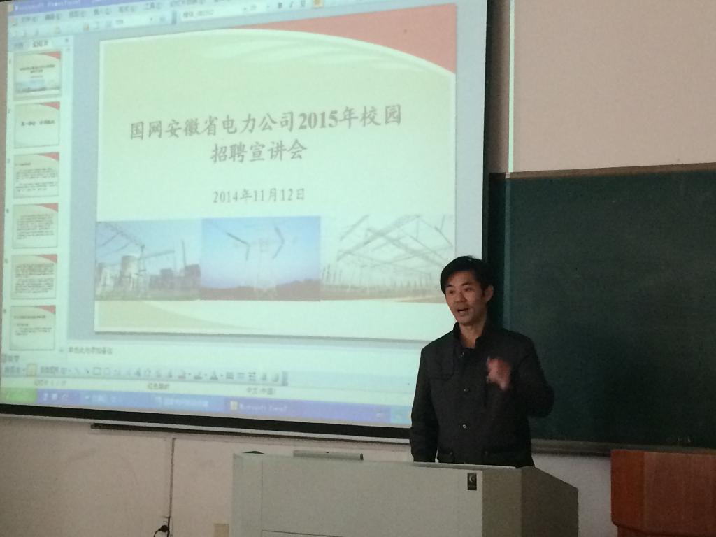 11月12日下午,马鞍山市供电公司在电气楼114室开展2015校园招聘宣讲。宣讲会由马鞍山市供电公司人力资源部主管戴德清主讲。我院2011级电气工程及其自动化、通信工程、电子信息工程等专业同学参与了本次宣讲。此次宣讲会为我院2015届毕业生提供了就业信息和就业机会。
