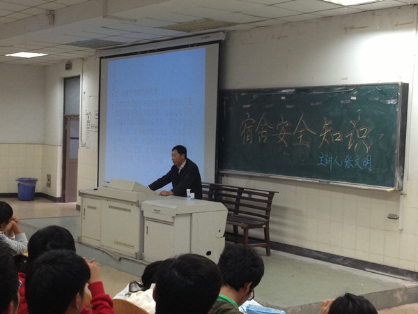 张文明结合实际案例就宿舍消防及防盗知识作了深入细致的讲解,号召2012级新生提高安全防范意识,远离高压电源,不要在宿舍使用大功率的电器和易燃品,外出离宿一定要确保财产的安全。张文明介绍了学校有关宿舍管理的一些新方法,特别提到将要在全校范围内的宿舍楼安装指纹识别机和刷卡进出宿舍这些利民的新举措,得到了大一新生的一致欢迎。