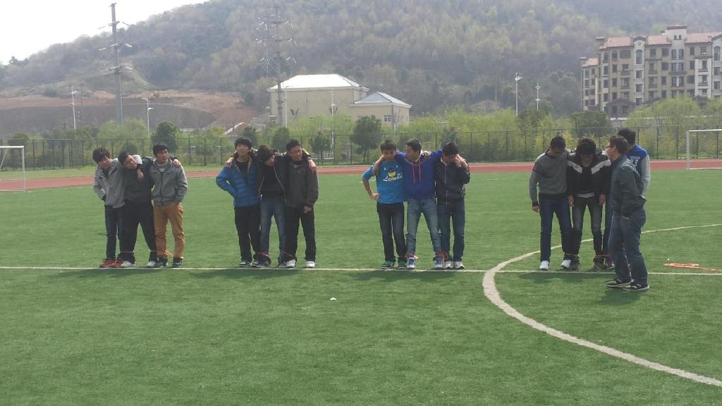 这是晴朗的一天,气122班的同学们吃过午饭早早地来到足球场上如火如荼地准备着即将开始的“三人四足”比赛,为了更好地发挥实力,提前到来的同学们先尝试练习了一番。