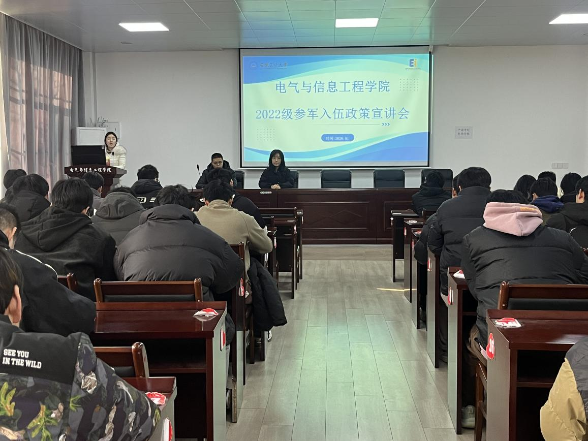 为深入贯彻落实国家征兵工作部署,帮助大学生全面了解参军政策,激发我院青年学子参军报国热情,1月8日下午,我院在电气楼113举办2026届毕业生参军入伍政策宣讲会,会议由辅导员甘如美江、杨恒基、孔瑜琦共同主持,全体毕业班学生参会。