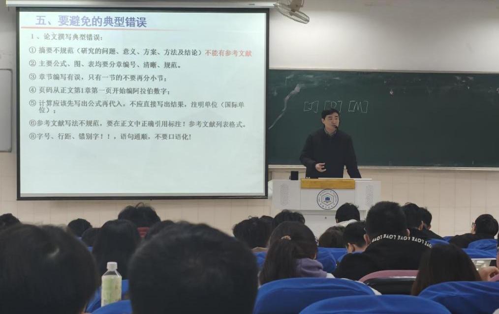 张前进深刻阐述了本科毕业设计的重要意义。他指出,毕业设计既是对学生四年专业知识与实践能力的综合检验,也是培养学生科研思维、创新能力和责任意识的关键载体,更是衔接校园学习与职场发展、学术深造的重要桥梁,直接关系到学院人才培养质量和每一位毕业生的未来发展前景。随后,他围绕毕业设计全流程展开系统讲解。从开题报告、中期检查到最终答辩的时间节点,从论文撰写规范、格式要求到成果提交标准,均进行了全面梳理;重点强调了学术诚信底线,明确指出抄袭、剽窃、伪造数据、代写代投等学术不端行为的严重危害,要求全体毕业生坚守学术道德,秉持诚信治学的优良作风,坚决杜绝各类学术不端行为。
