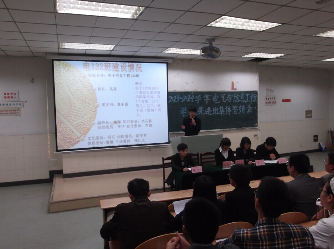 为了弘扬班级文化,展现班级风采,丰富校园生活,激励班级建设,10月16日晚,电气与信息工程学院在阶教201举办2013-2014年度“校先进班级”评选答辩会,学院党委副书记、副院长郭宏出席,全体辅导员和部分班主任参加,答辩班级全体同学参与,全院班长和团支书现场观摩。